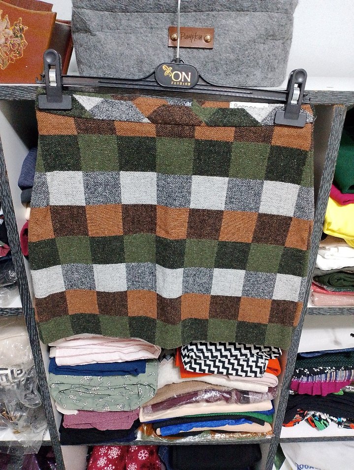 Örgü yün kumaştan, kahverengi, yeşil ve gri kareli desenli, bohem ve retro tarzda, günlük kullanıma uygun, vücuda oturan midi etek.