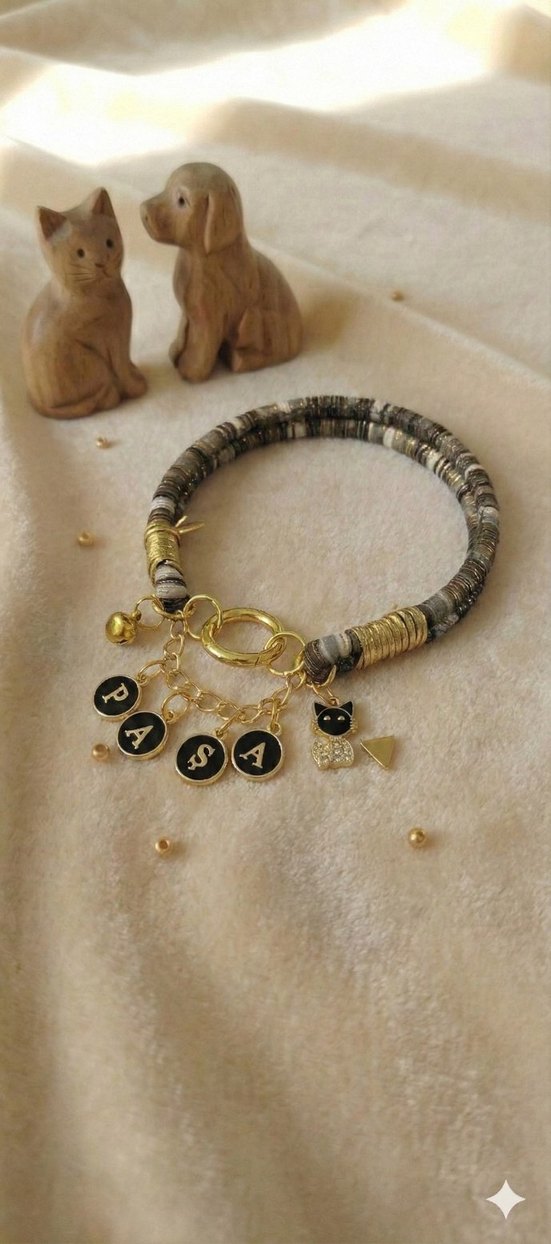 Bohem tarzda, tamamen el yapımı altın detaylar içeren, üzerinde isim yazan harfli ve figürlü charmlar bulunan modern tasma. istenilen isimde yazılır. isim ve boyun ölçüsü vermeniz yeterlidir