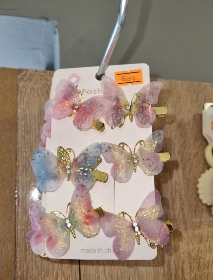 Bohem tarzda, pastel renklerde kelebek figürlü saç tokaları seti. Tie-dye desenli ve zarif fiyonk detaylı. Çin malı.