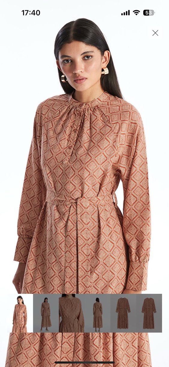 Yüksek yakalı, uzun kollu, bol kesim uzun bej elbise. Kemerli ve hafif batik desenlidir, bohem tarzı yansıtır. Yenidir bir kez giyildi.Teklife açıktır.