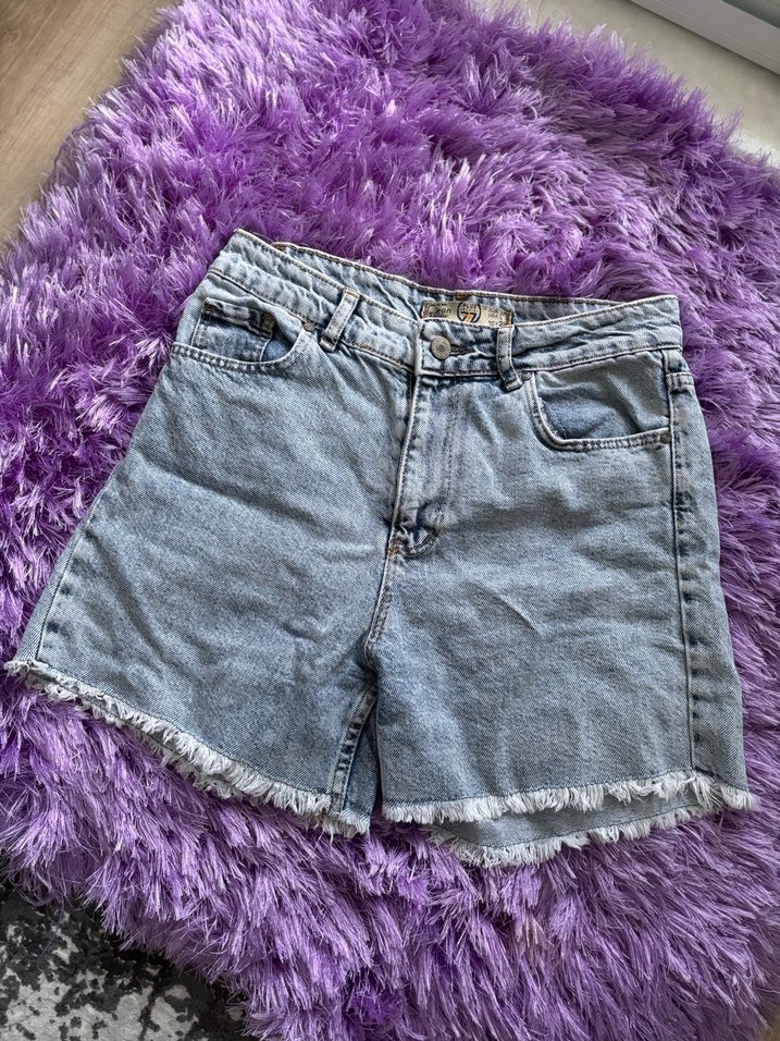 Bol kesim, kısa boy mavi denim mini şort. Rahat ve retro havasıyla, hafif batik desen ve yıpranmış kenar detayına sahip. Günlük kullanıma uygun.