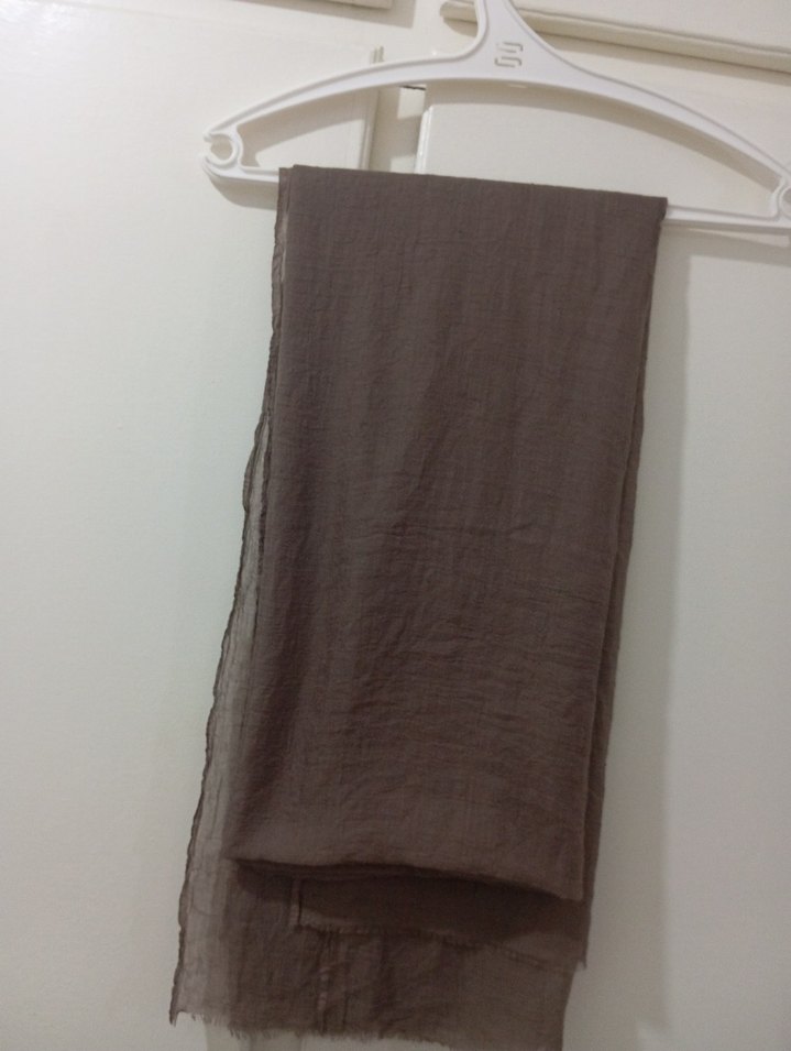 Keten kumaştan, bohem ve minimal tarzda, gri-bej tonlarında drapeli kadın şal.