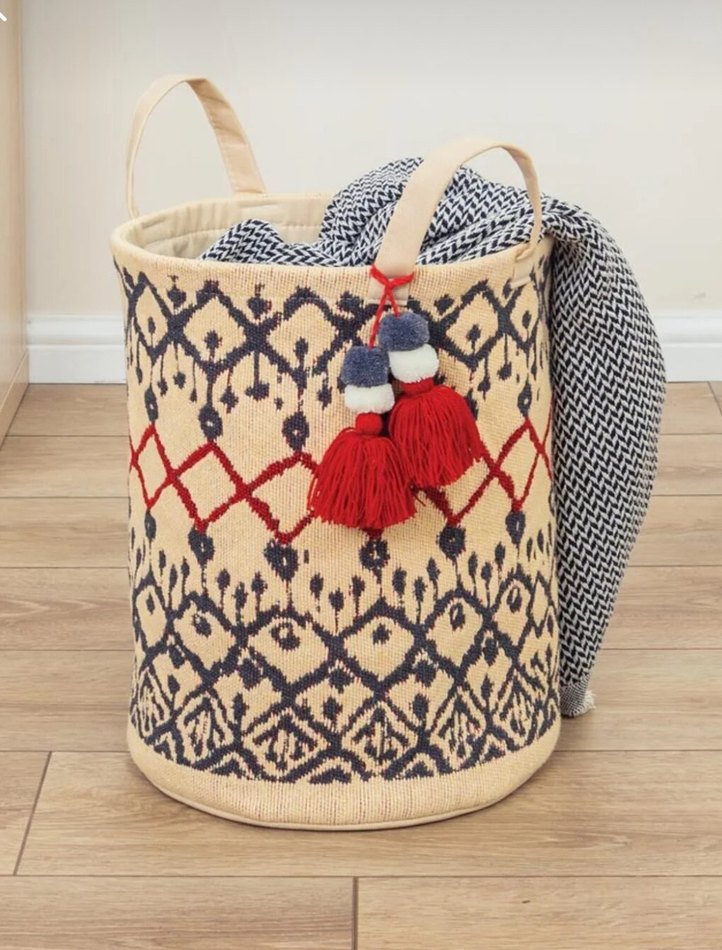 Bohem tarzda, geleneksel kilim desenlerine sahip yuvarlak sepetler, dekoratif saklama için uygundur.