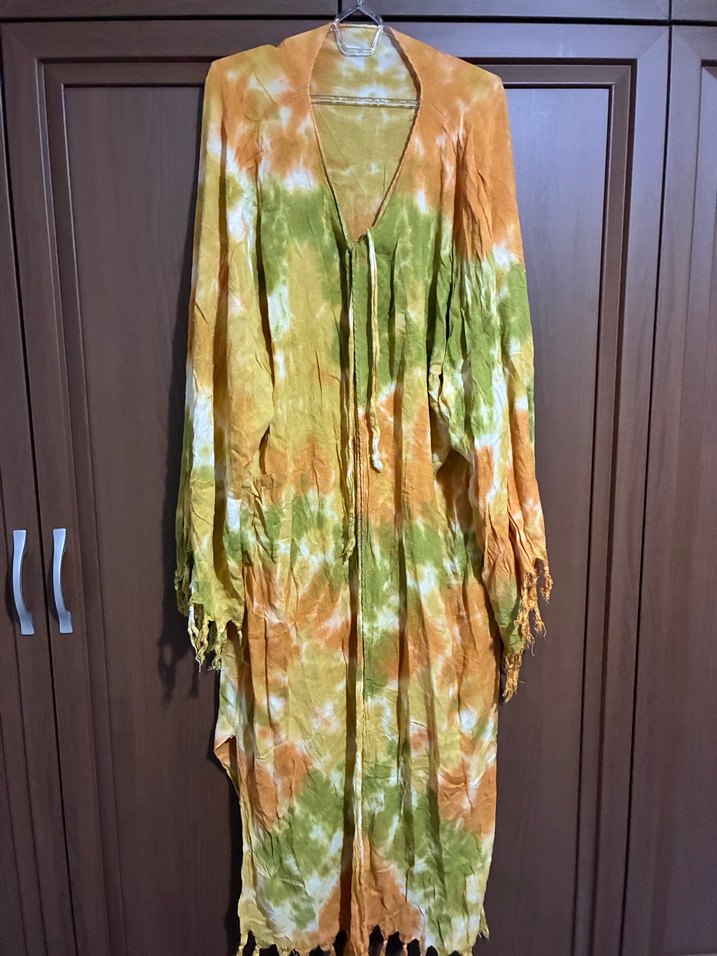 Kadınlar için uzun, bol kesim, yeşil ve turuncu tonlarında pastel tie-dye desenli kimono. Uzun kollu, drapeli, bohem tarzına uygun. #plajelbisesi #pareo #kimono