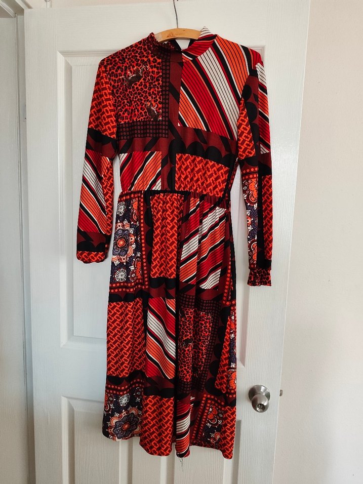 Fitted kesim, yüksek yakalı ve uzun kollu bu uzun elbise, pileli dokuma kumaştan yapılmıştır. Canlı kırmızı bohem desenlere sahiptir, günlük kullanım için uygundur.