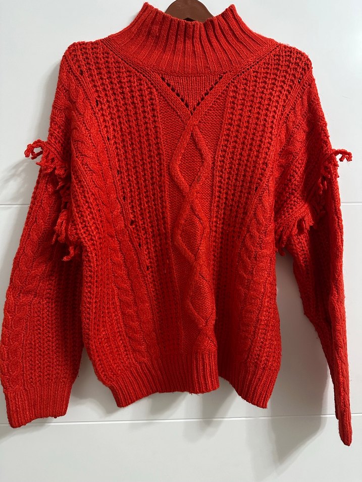 Bohem Kırmızı Örgü Yüksek Yakalı Kadın Kazak