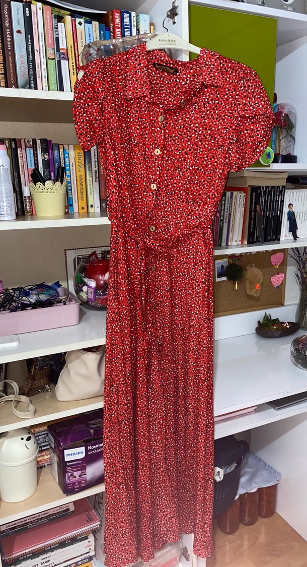 Kırmızı desenli, kısa kollu, yakalı ve düğmeli uzun üstü dar altı salaş kesim kadın elbisesi. Yumuşak pamuk kumaştan, vintage bohem tarzını yansıtan günlük kullanıma uygun.