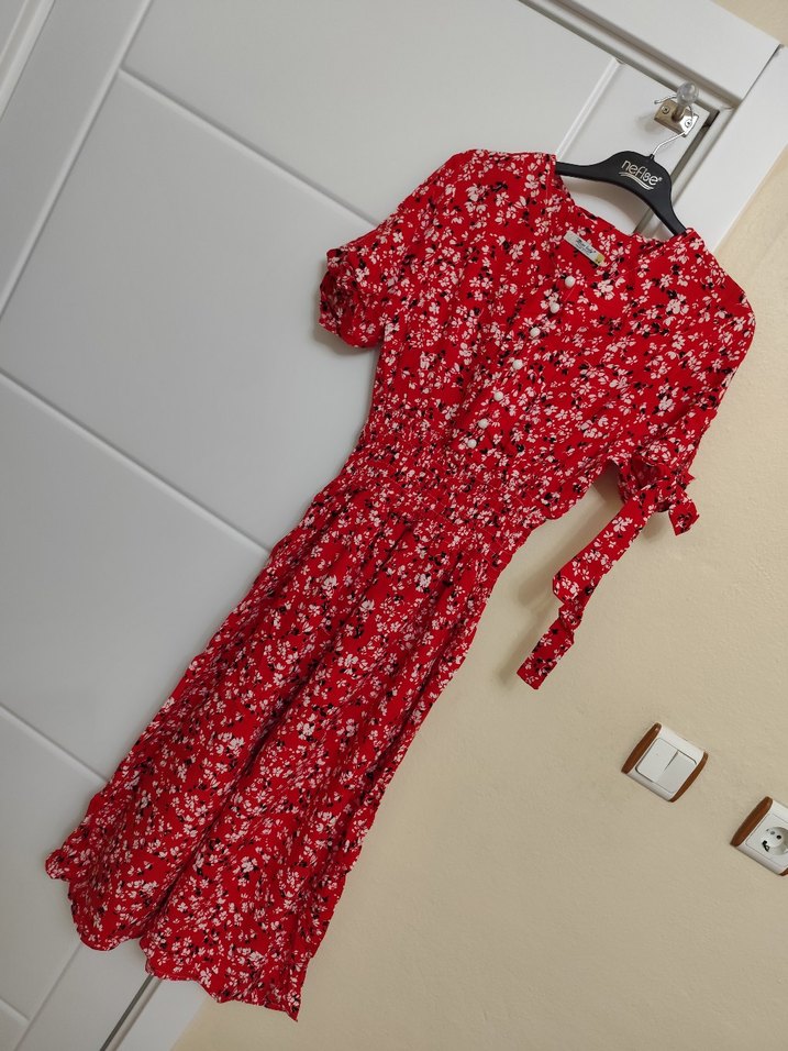 Renkli batik desenli, V yakalı ve düğmeli uzun, bol kesim elbise. Yumuşak sentetik kumaştan, bohem tarzda, günlük kullanıma uygun.