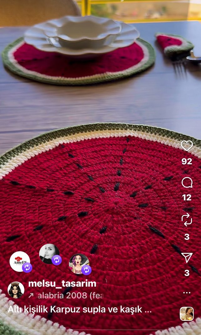 Bohem tarzda kırmızı ve yeşil renklerde, el işi tığ işi yuvarlak Amerikan servis. Masanıza sıcaklık katar. 6 kişilik supla ve çatal kaşıklık dilim karpuz sunumluk
