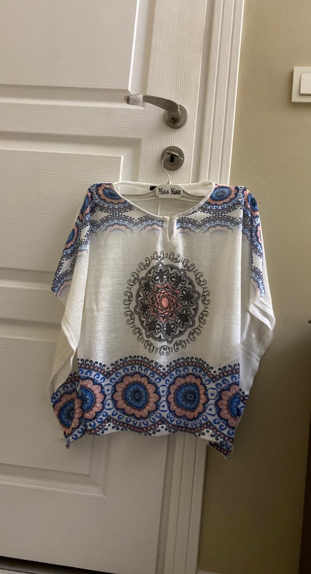 kısa kollu, yuvarlak yaka, bol kesim bluz. Hafif renklerde, sentetik yumuşak kumaştan, kısa boyda bohem tarzı.