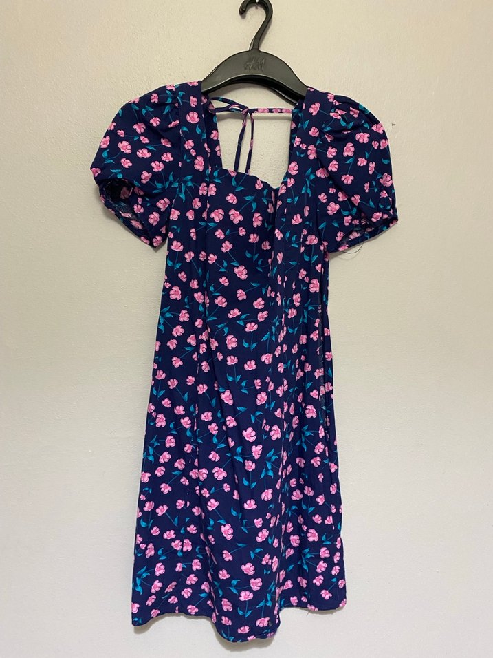Renkli çiçekli desenli, kısa kollu ve , bohem tarzda midi elbise. Yumuşak sentetik kumaştan, günlük sokak stili için uygun.