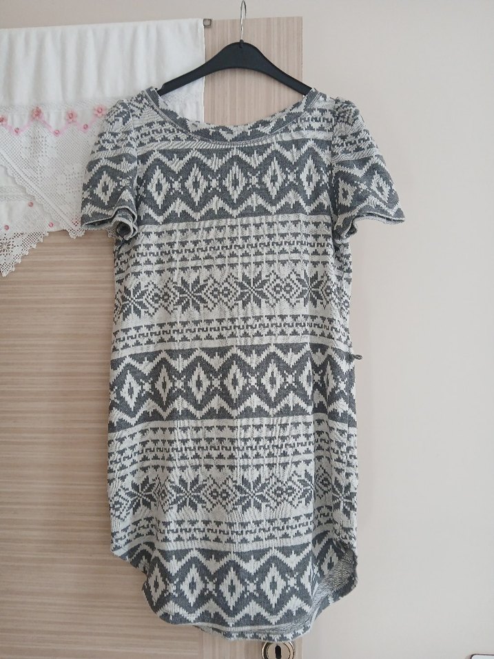 Gri renkli, kısa kollu ve yuvarlak yakalı, bol kesim triko elbisedir. Bağlama desenleri bohem tarzı yansıtır, günlük kullanım için uygundur.