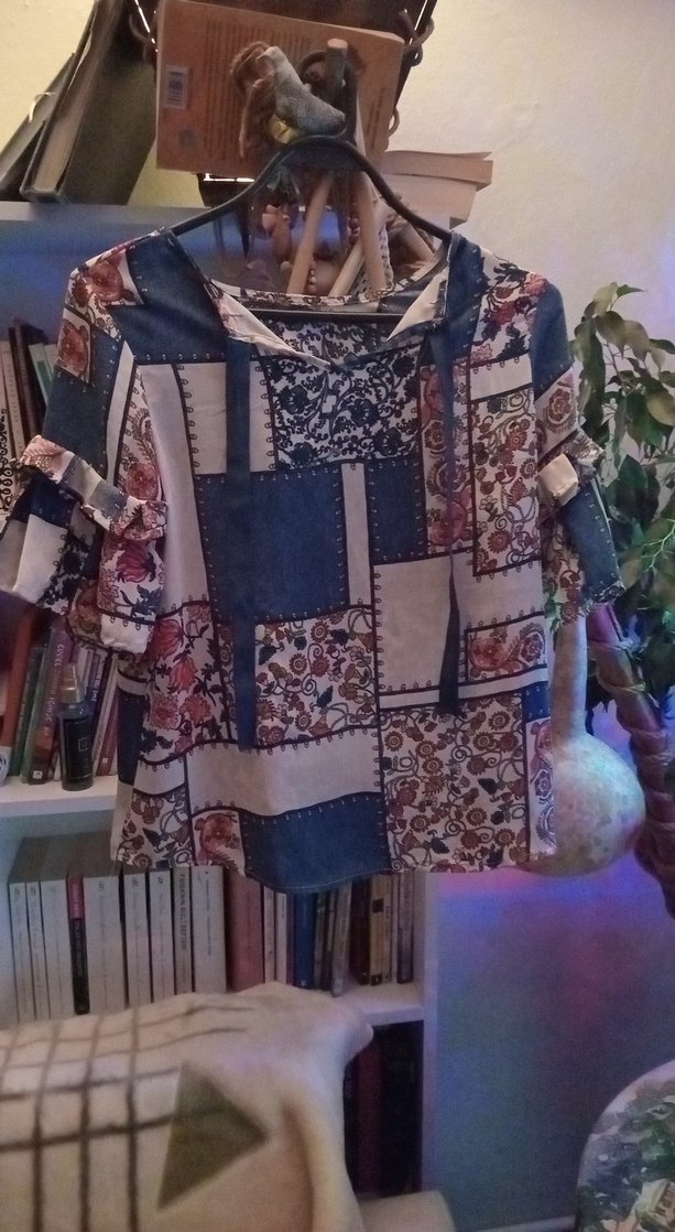 Bu bol kesim bluz, kısa kollu ve koyu tonlarda çoklu desenlere sahiptir. Yuvarlak yakalı ve kısa boydadır, bohem tarz için uygundur. S yaizuro ama m da tamamdır.