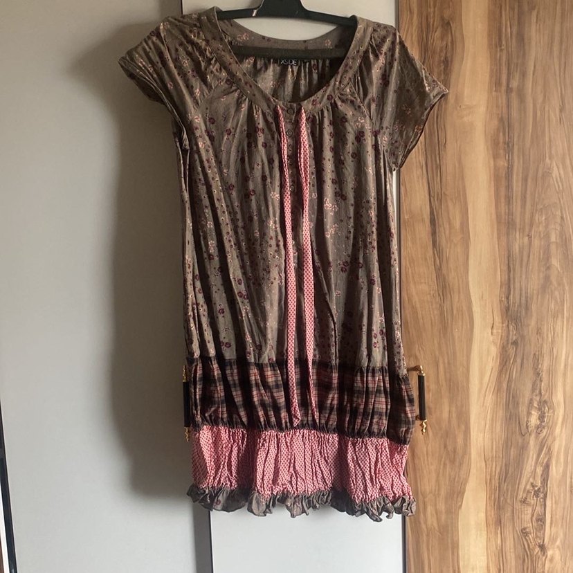 Kısa kollu, bohem tarzda salaş hamile elbise. Kahverengi ve gri tonlarda batik desenli, mini boy ve dökümlü. Günlük kullanıma uygun. Boyu 88 Beli 48 ve genişleyebilir Lastikli rahat salaş elbise Yeni gibidir 1-2 defa giyilmiştir.