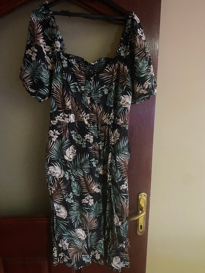 Bu uzun, bol kesim elbise, straplez yaka, kısa kollu ve düğmeli ön tasarıma sahiptir. Koyu renkli, çok renkli batik deseni bohem tarzı yansıtır. Sentetik kumaştan üretilmiştir ve günlük kullanıma uygundur.