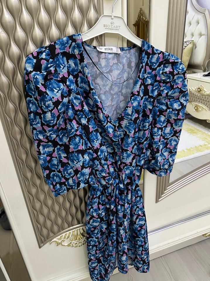Bohem tarzda, kısa kollu, bol kesim mini elbise. Lacivert ve mavi tonlarında batik desenlidir.