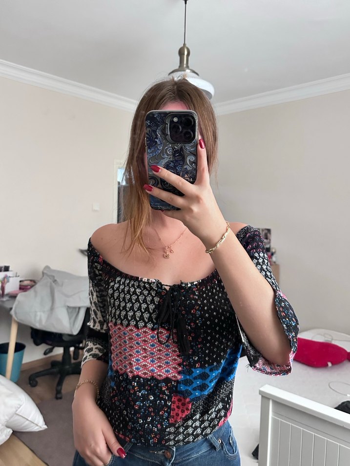 Bohem Tarz Yarım Kollu Bluz. Ürünün etiketlerini kesmişim o yüzden bedenini bilmiyorum maalesef fakat biraz bol oluyor. M/L beden için uygundur.