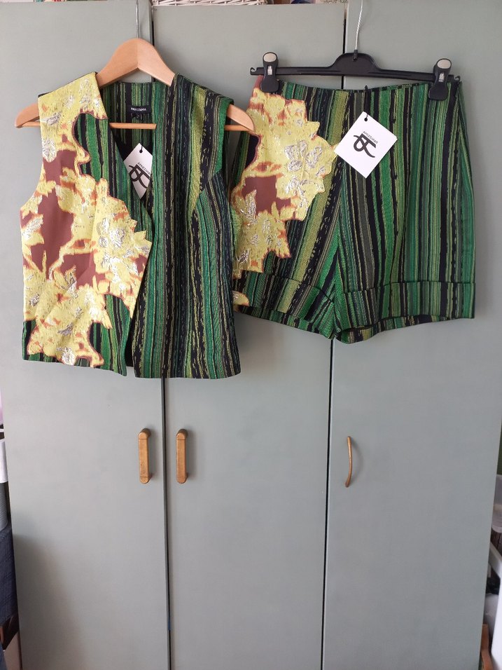 Panizsima marka etiketi üzerinde şort yelek takım.38 bedendir.Yelek eni 46 cm boy 50 cm .Şortun beli 37 cm boy 43 cm gibidir
