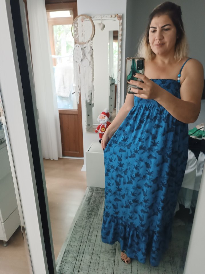 Koyu mavi, askısız midi bohem elbise bol kesim ve batik desenli. Drapeli ve kolsuz tasarımıyla romantik akşamlar için uygun.