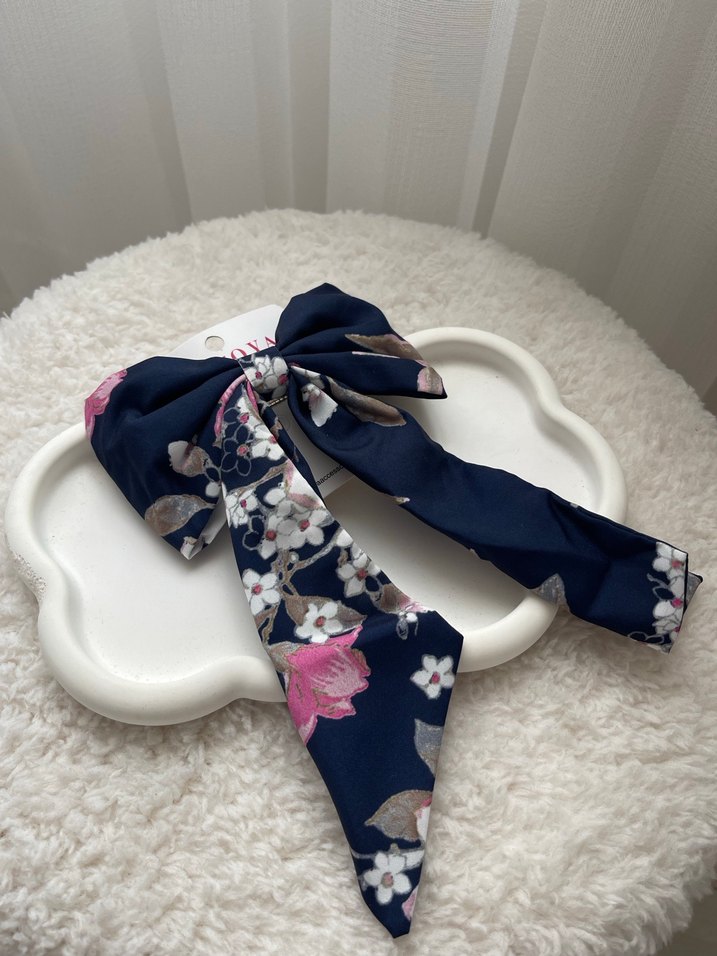 Sentetik kumaştan yapılmış, koyu mavi çiçek desenli bohem tarzı fiyonk saç aksesuarı.