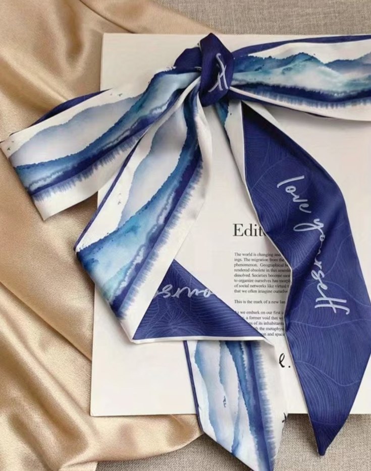 Mavi tonlarda, bohem tarzda kurdele detaylı, ipek görünümlü şık bir fular. Pastel canlı renkleri ve Paris esintili tasarımıyla öne çıkar. ✨