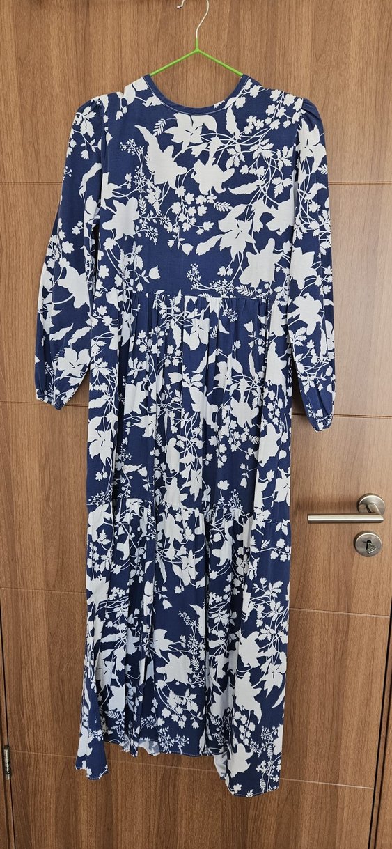 Bohem tarzda, lacivert beyaz çiçek desenli, uzun kollu, dökümlü, rahat kesim kadın elbisesi. Günlük kullanım için uygundur.