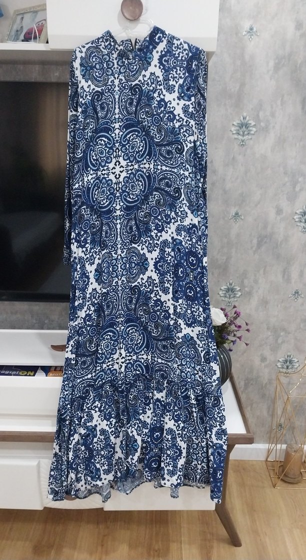 Lacivert beyaz desenli, drapeli, straplez ve kolsuz bohem tarzda uzun, vücuda oturan bir elbisedir. Dış mekan kullanıma uygundur. viskon kumaş