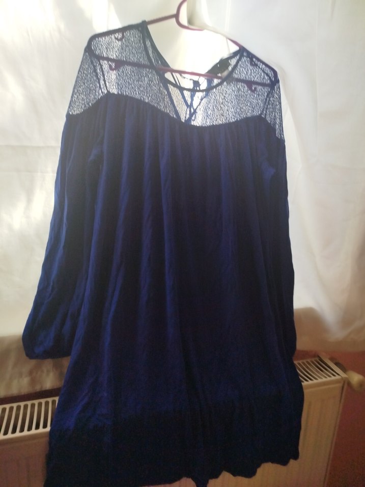 Bohem tarzda, V yakalı, drapeli ve dantelli yaka detayı olan lacivert midi elbise. Salaş kesim ve ince askılarla romantik akşamlar için ideal.