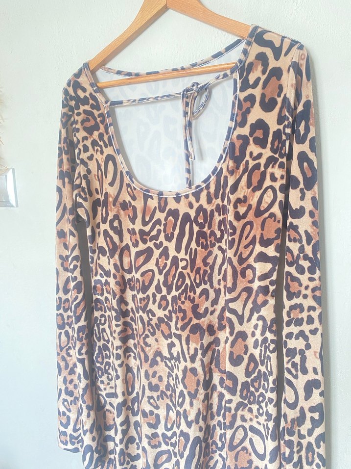 Uzun kollu, kayık yaka, bol kesim kahverengi hamile bluzu. Leopar desenli, dökümlü tasarıma sahip yumuşak sentetik kumaftan.