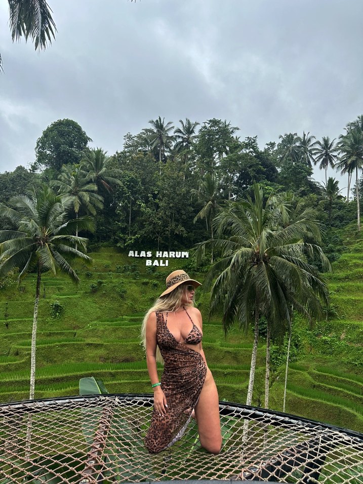 Koyu kahverengi leopar desenli, dantelli, askılı ve vücuda oturan kadın bikini takımı, açık hava için uygun. 1 defa giyilmiştir