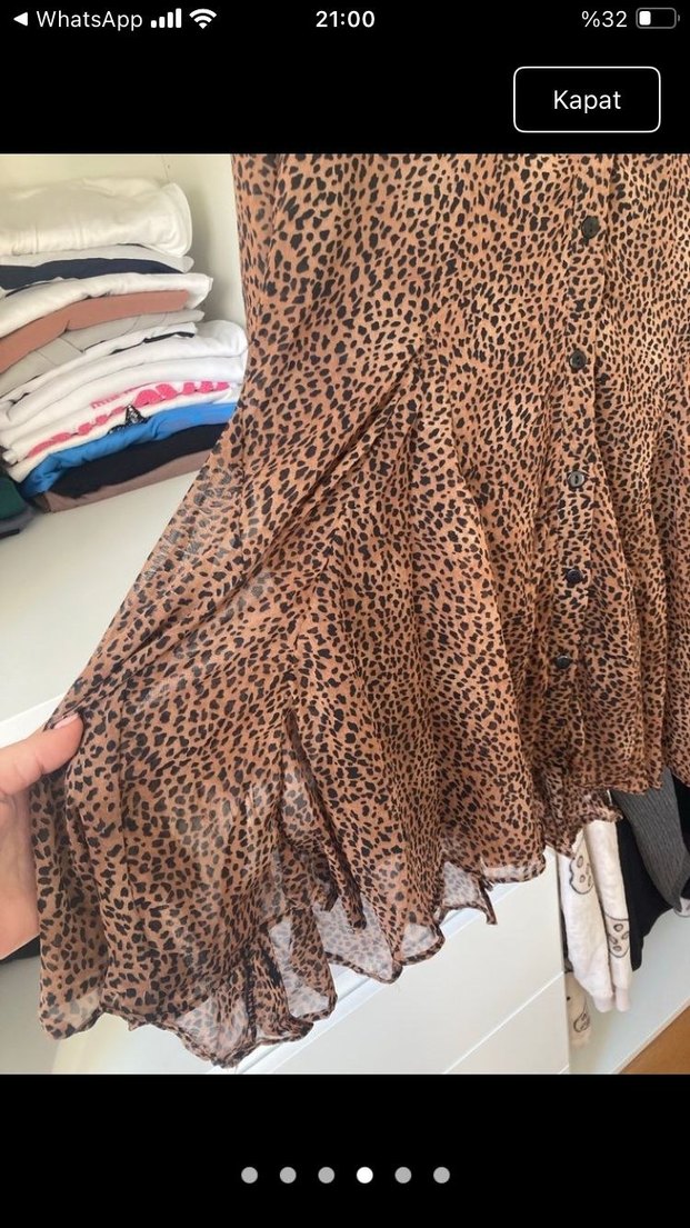 Bohem tarzda, kahverengi leopar desenli, bol kesim ve fırfırlı etek, midi boyda ve günlük kullanıma uygun.