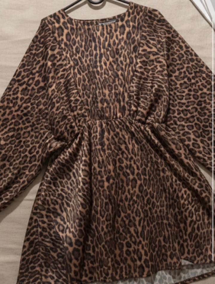 Kahverengi leopar desenli, bol kesim, uzun kollu midi boy kadın elbisesi, rahat ve bohem tarz sunar.