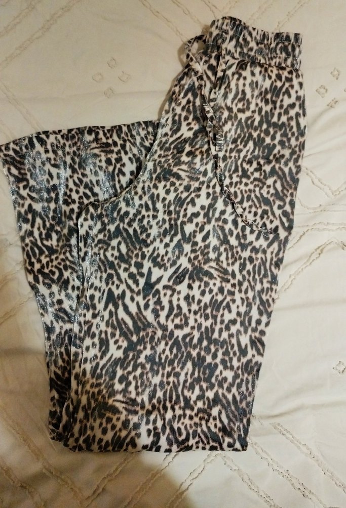 Koyu kahverengi leopar desenli, dökümlü tasarıma sahip bol kesim kadın pantolon. Yumuşak sentetik kumaştan,sim detaylı,bohem tarzıyla outdoor sokak giyimine uygun.