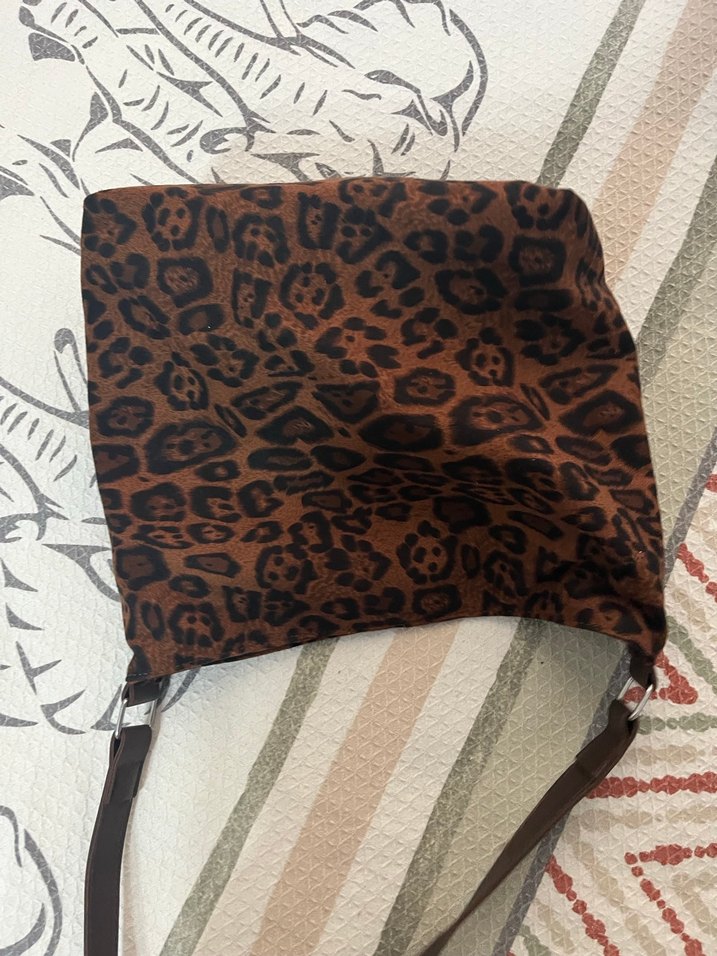 Kahverengi bohem tarzda, koyu leopar desenli, tokalı saplı sentetik kumaş kadın çantası.