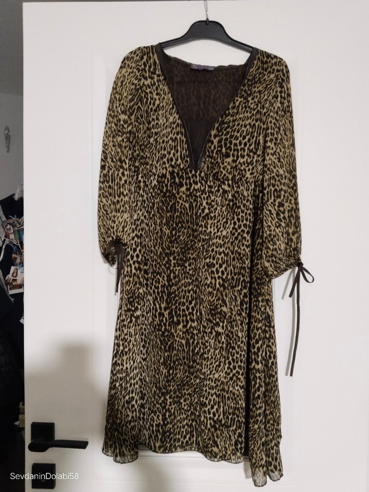 Uzun, bol kesim kadın elbisesi; rahat bohem tarzı, uzun kollu ve koyu kahverengi leopar desenli.