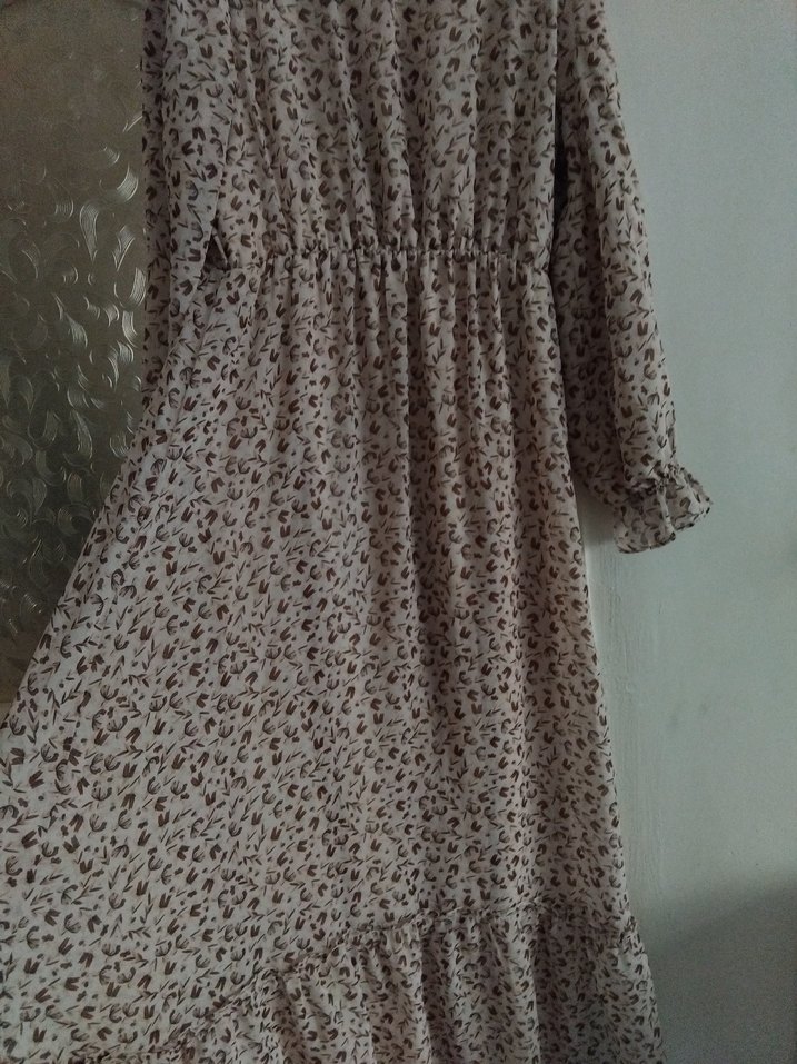 Bohem tarzda, leopar desenli bej uzun kollu elbise. Rahat kesim, V yaka ve fırfır detaylara sahip, yumuşak sentetik kumaştan üretilmiştir.