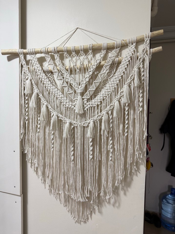 El yapımı bohem makrome duvar dekoru, karmaşık düğüm desenleri ve püskül detaylarıyla doğal bir dokunuş sağlar.