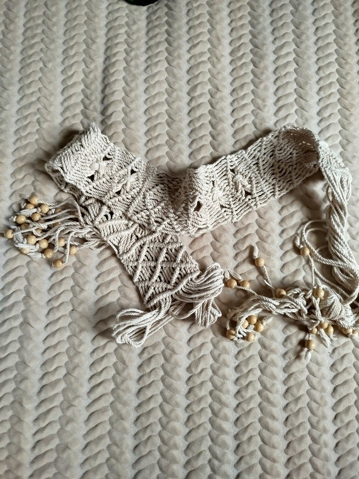 El yapımı bohem makrome kemer, karmaşık düğüm desenleri ve ahşap boncuk detaylarına sahip. Yumuşak doğal iplikten yapılmış, dekoratif püsküllü. Baştan sona 150 cm
