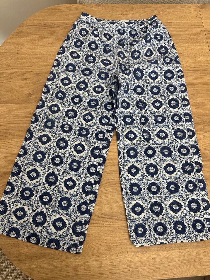 Bol kesim, uzun boy kız çocuk kumaş pantolon, koyu mavi bağlama desenli detaylara sahip, bohem tarz için uygun beli geniş ama lastikli değildir..