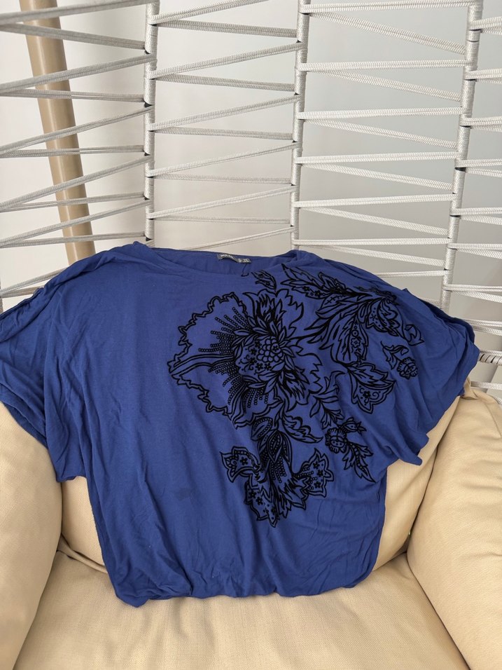 Kısa kollu, drapeli, bol kesim mavi bluz. Siyah çiçek desenli, yuvarlak yakalı, bohem tarzda, günlük kullanıma uygun.