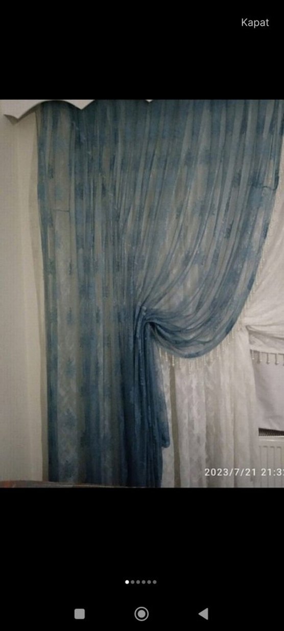 Yumuşak, yarı saydam kumaş üzerinde mavi batik desenli, bohem tarzda perde. Her odaya rahat ve sanatsal bir hava katar.