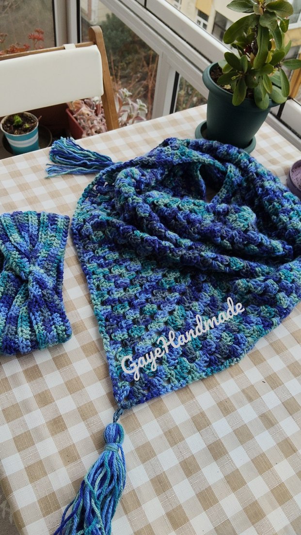 Kadınlar için koyu mavi batik desenli, bohem tarzda örgü atkı ve bandana seti. ipinden dolayı sadece 1 adet örülmüştür hemen teslim durumundadır eğer isterse hediye paketi yapılacaktır.
