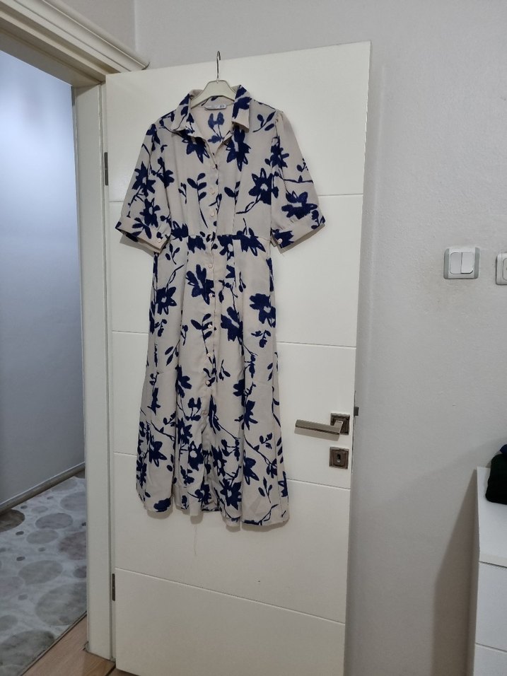 Mavi beyaz desenli, kısa kollu, yakalı ve düğmeli uzun bohem elbise. Rahat kesimi ve yumuşak sentetik kumaşıyla gündelik kullanıma uygundur.