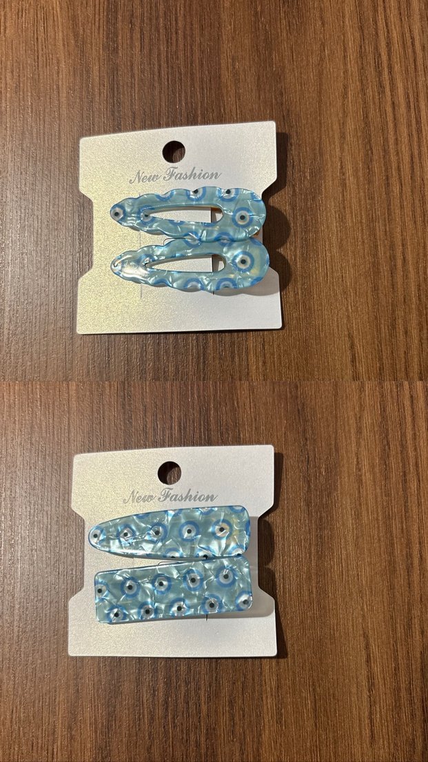 Plastik malzemeden yapılmış, boncuklu mavi saç tokası seti. Pastel tonlarda, bohem ve vintage tarzda tasarlanmıştır. Kart üzerinde "Fashion" yazısı bulunur.