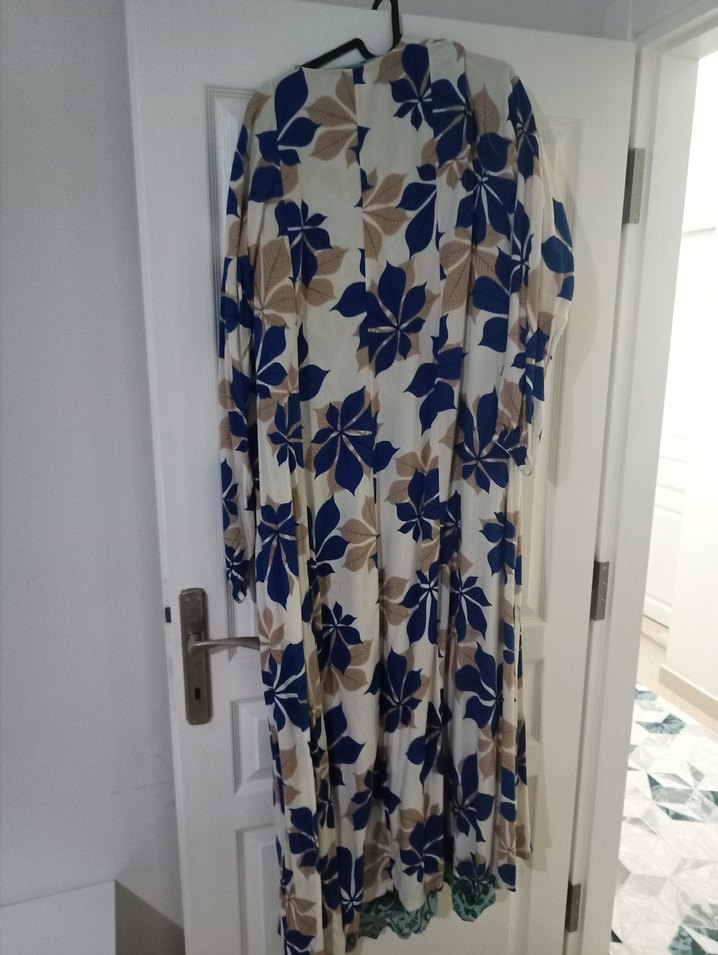 Bohem tarzı, uzun kollu, yakası kesik detaylı, mavi ve bej çiçek desenli, bol kesim, günlük kullanıma uygun uzun elbise.