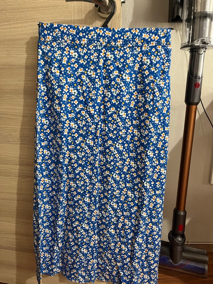 Kadınlar için uzun etek, drapeli tasarım ve koyu mavi çiçek desenine sahiptir. Sentetik kumaştan yapılmış, bohem tarzda ve regular fit kesimlidir.
