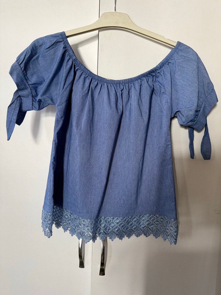 Mavi denim kumaştan, straplez yakalı, kısa kollu ve uçları bağcıklı, nakışlı fırfır detaylı bohem tarzda, bol kesim kısa bluz. Over size olsun isterseniz s bedenlerde giyebilir.