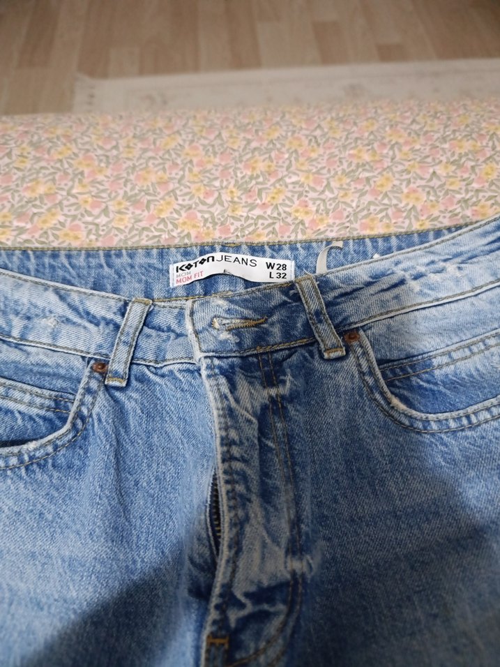 Düğmeli, geniş kesim mavi kot pantolon. Pastel tonlarda tie-dye desenli, midi boy, bohem ve retro tarzına uygun.