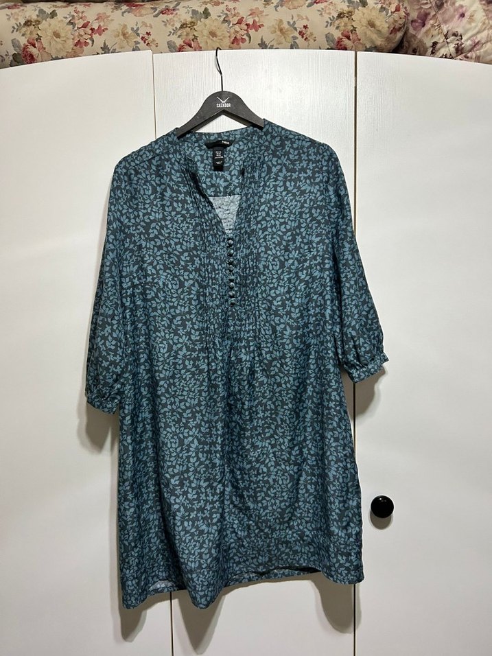 Yumuşak keten kumaştan, düğmeli ve V yakalı bohem tarzda mavi elbise. Uzun kollu ve midi boy, günlük konfor sağlar.