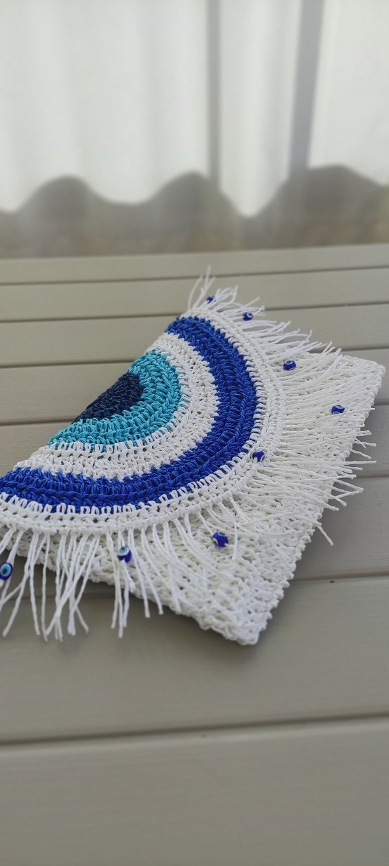 Bu kadın clutch çanta, açık mavi ve beyaz örgü kumaş, nakışlı desenler ve boncuk detaylarıyla bohem tarzındadır. Püsküllü kenarları ve outdoor kullanıma uygundur.